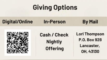 Evening services will be held at 5:00 p.m. on Sundays and 7:00 p.m. Monday through Saturday. If you’re joining us for the first time, the address is: 30682 Chieftain Drive, Logan, OH 43138.